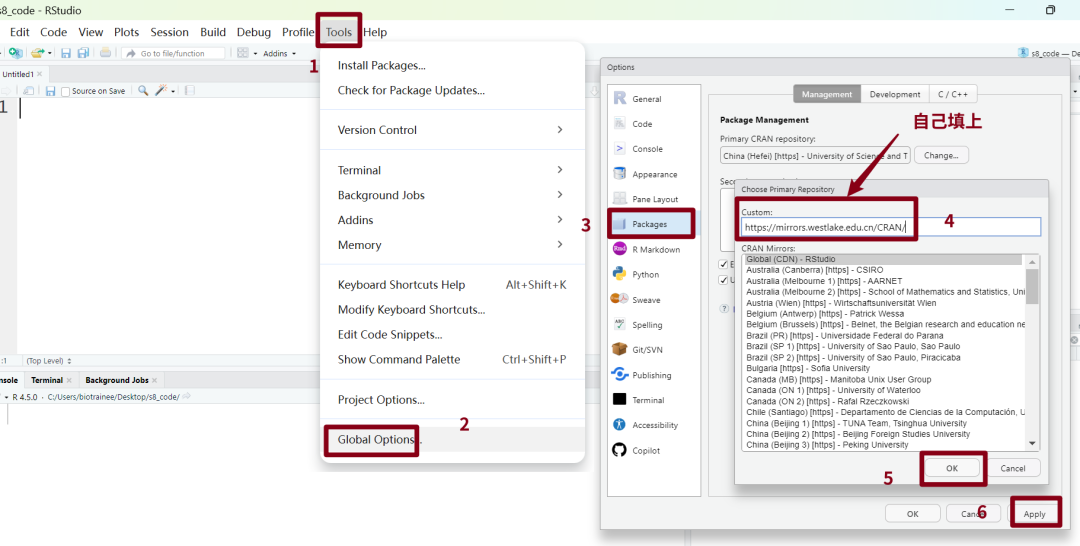 学生说想要在Rstudio的Tools-Global Options里面设置西湖大学的镜像,但是在软件提供的镜像列表里面找不到西湖大学。