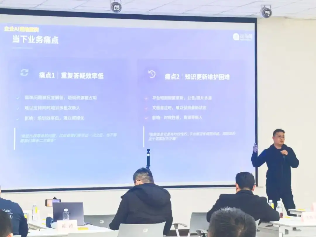 在案例分享环节,陈涛结合售前咨询、售后运维、内部培训、专业问答与高价值文档生成等多个真实业务场景,直观展示了司马阅AI解决方案的落地成效。他特别强调,企业AI落地并非追求“颠覆式”变革,而是要深度嵌入现有业务流程,精准解决高频、重复、专业要求高的实际问题,实现效率提升与风险可控的双重目标。同时,AI落地不是一次性的部署工程,而是一个与业务深度共创、持续迭代演进的长期过程。