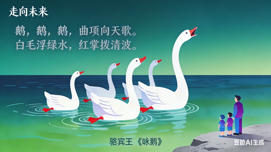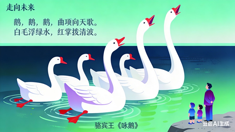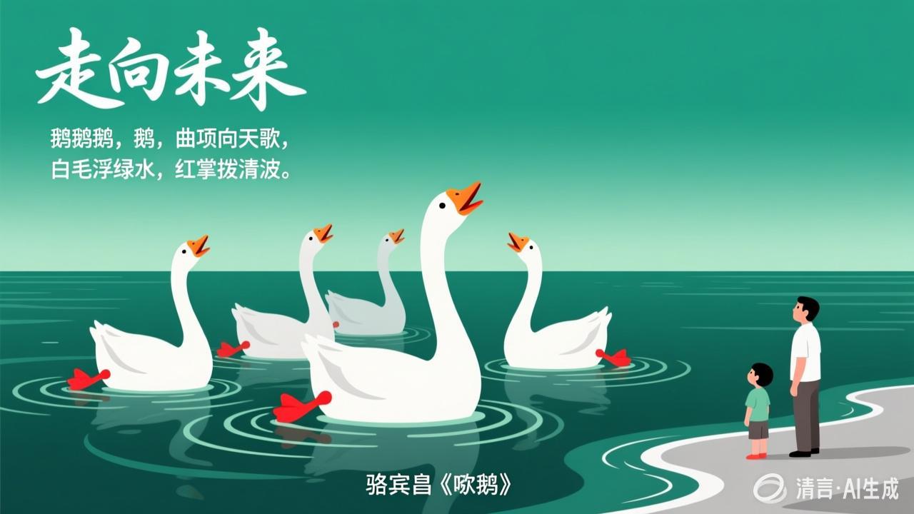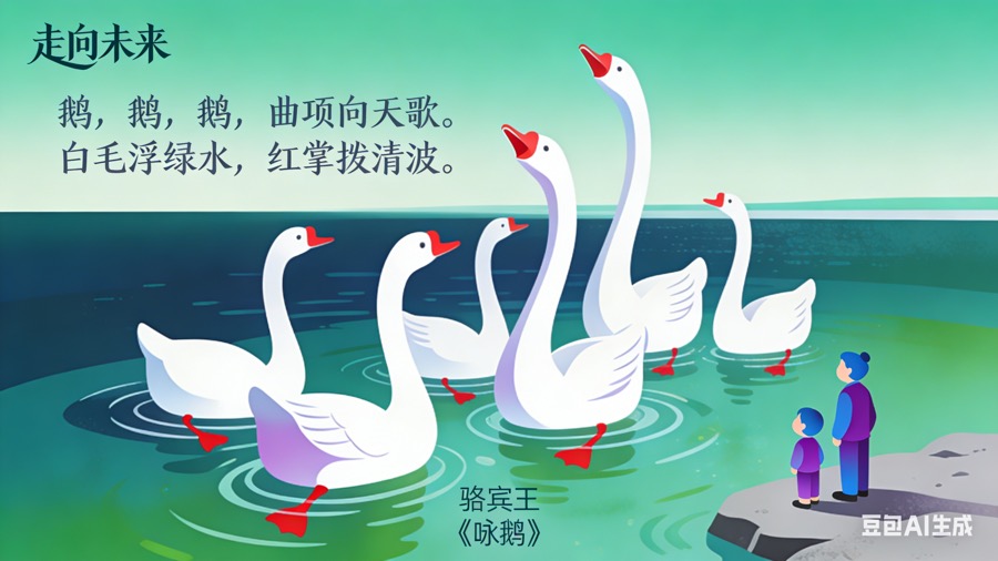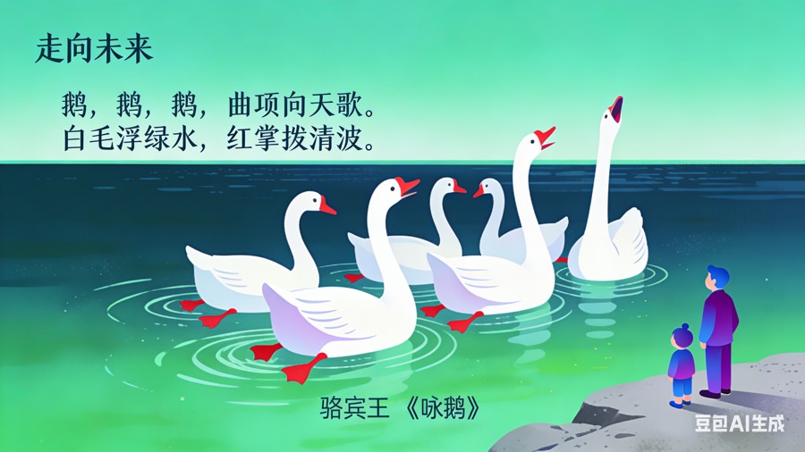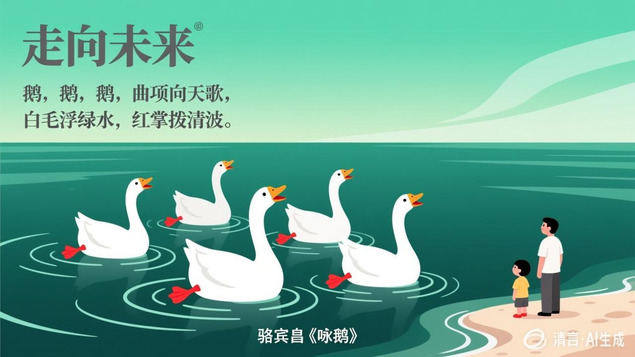 ## 视觉描述 企业孟菲斯风格插画,扁平化人物与动物,夸张的比例与非写实肤色(蓝/紫色调)。整体色调以深海绿、艾绿为基底,点缀洋水仙红与水牛灰。采用环绕运镜(Orbit shot)的视角,营造360度动态展示感,画面构图稳定,主体清晰。比例16:9。 ## 内容描述 画面中心偏下位置,一群白色的鹅以夸张的扁平化造型呈现,其长长的弯曲的脖子向着天空,喙部微张似在歌唱。鹅的身体漂浮在由深海绿和艾绿构成的、带有细微波纹的水面上,红色的脚掌(洋水仙红)正在拨动清澈的绿波,激起柔和的水纹。在画面右下角的浅滩或岩石(水牛灰色)上,站着一个比例较小的扁平化儿童人物及其爸爸,静静地看着白鹅的歌唱,与鹅的生动形成静谧对比。背景是简洁的、渐变的艾绿色天空与水际线,风格整体明亮、快乐,带有科技插画的流动感。 ## 标注文字 在画面左上方的留白区域,使用具有古典书法韵味、笔画清晰且易于辨识的字体(如楷体或仿宋变体),以水牛灰色书写古诗内容:“鹅,鹅,鹅,曲项向天歌。白毛浮绿水,红掌拨清波。”,文字大小适中,排版疏朗,与画面风格和谐。 在画面底部居中偏右的位置,使用简洁的无衬线字体,以深海绿色较小字号标注诗人“骆宾王”及诗题“《咏鹅》”,作为落款,不干扰画面主体。 在图片的左上角用专业优美的字体标注“走向未来”,请注意,字不要太大。