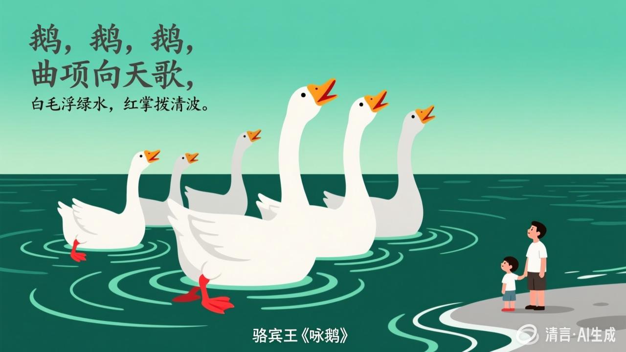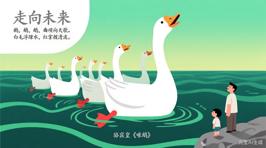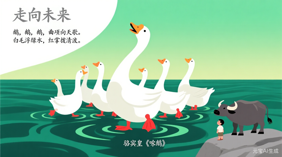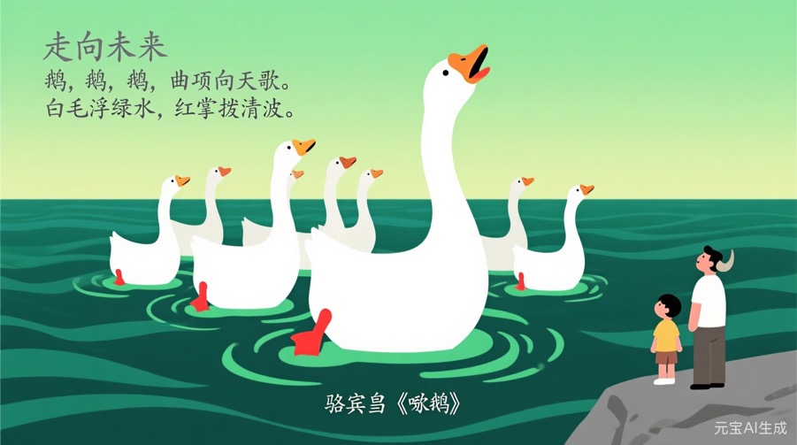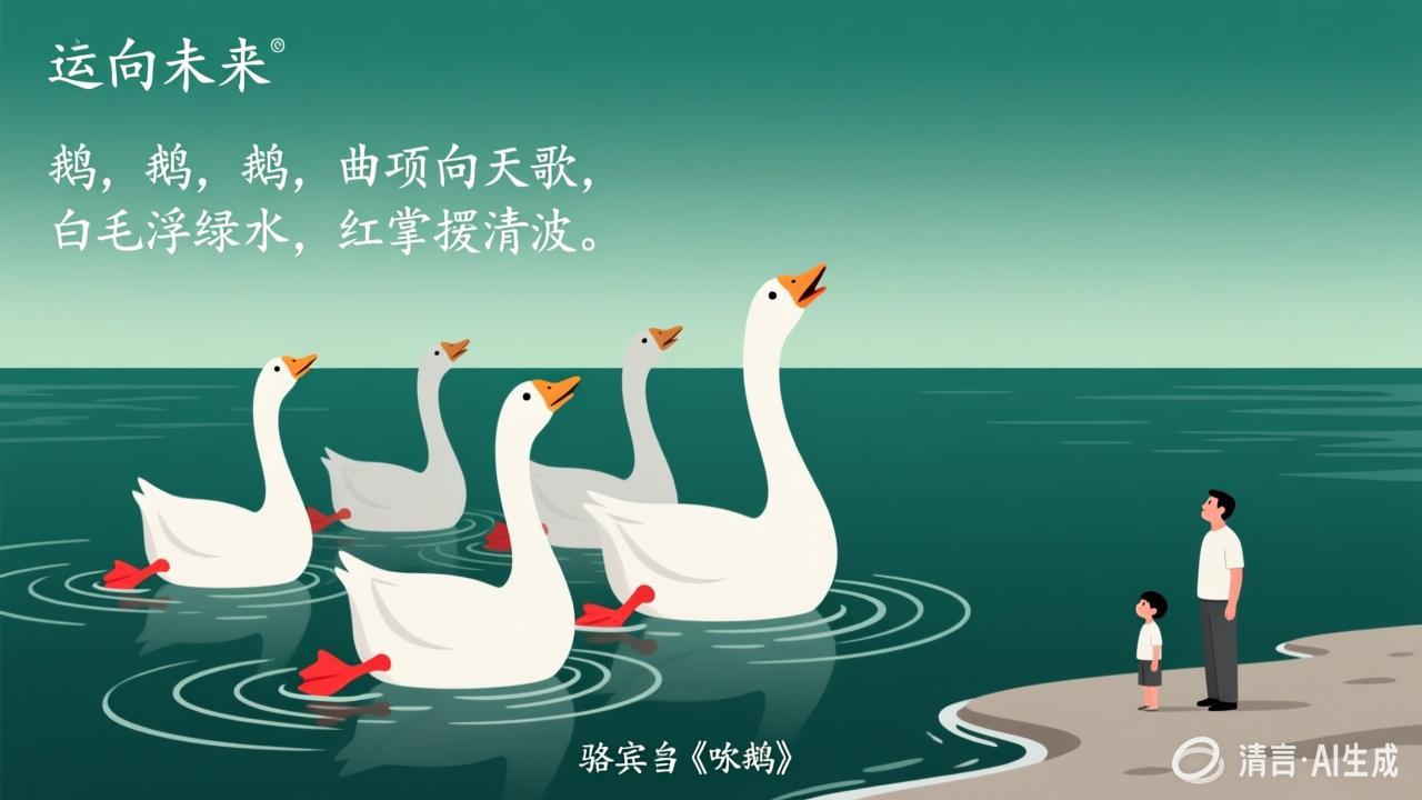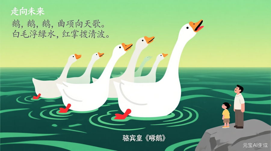 ## 视觉描述 企业孟菲斯风格插画,扁平化人物与动物,夸张的比例与非写实肤色(蓝/紫色调)。整体色调以深海绿、艾绿为基底,点缀洋水仙红与水牛灰。采用环绕运镜(Orbit shot)的视角,营造360度动态展示感,画面构图稳定,主体清晰。比例16:9。 ## 内容描述 画面中心偏下位置,一群白色的鹅以夸张的扁平化造型呈现,其长长的弯曲的脖子向着天空,喙部微张似在歌唱。鹅的身体漂浮在由深海绿和艾绿构成的、带有细微波纹的水面上,红色的脚掌(洋水仙红)正在拨动清澈的绿波,激起柔和的水纹。在画面右下角的浅滩或岩石(水牛灰色)上,站着一个比例较小的扁平化儿童人物及其爸爸,静静地看着白鹅的歌唱,与鹅的生动形成静谧对比。背景是简洁的、渐变的艾绿色天空与水际线,风格整体明亮、快乐,带有科技插画的流动感。 ## 标注文字 在画面左上方的留白区域,使用具有古典书法韵味、笔画清晰且易于辨识的字体(如楷体或仿宋变体),以水牛灰色书写古诗内容:“鹅,鹅,鹅,曲项向天歌。白毛浮绿水,红掌拨清波。”,文字大小适中,排版疏朗,与画面风格和谐。 在画面底部居中偏右的位置,使用简洁的无衬线字体,以深海绿色较小字号标注诗人“骆宾王”及诗题“《咏鹅》”,作为落款,不干扰画面主体。 在图片的左上角用专业优美的字体标注“走向未来”,请注意,字不要太大。