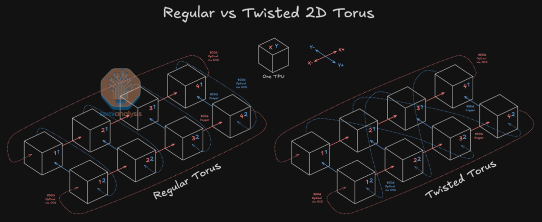 随着单芯片TDP提升至600W且集群规模突破 9,216 卡,TPUv7 (Ironwood) 面临着更严峻的散热与延迟挑战,Google 在架构上进行了两项重大升级: 拓扑算法的扭曲 与 集群规模的极致扩张 。