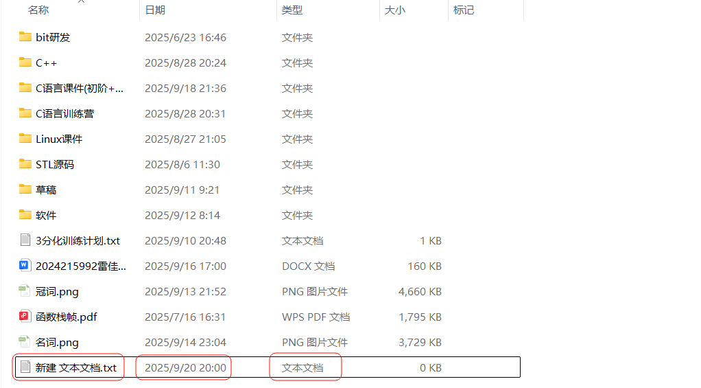 我圈的红色的就属于文件属性,然后我们可以观察到文件的大小为0KB,但是实际上他只是指文件内容的大小为0KB代表是一个空文件,文件属性实际也会占内存的