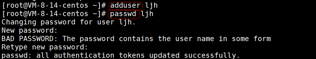 在 CentOS 系统中,使用 adduser ljh 命令创建用户 ljh,接着用 passwd ljh 命令为该用户设置密码时,系统提示 “BAD PASSWORD: The password contains the user name in some form”,即密码包含了用户名相关形式,存在安全风险,但最终密码仍成功更新(显示 passwd: all authentication tokens updated successfully.)。