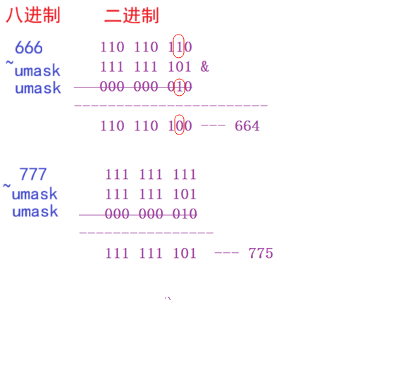 从图中圈出的二进制位变化可以清晰看到,umask 二进制中为 1 的对应位置,会使得默认最大权限(文件 666 对应二进制 110 110 110、目录 777 对应二进制 111 111 111)在这些位置的权限被 “删除”。