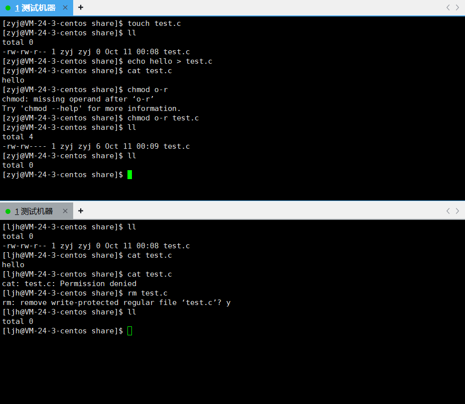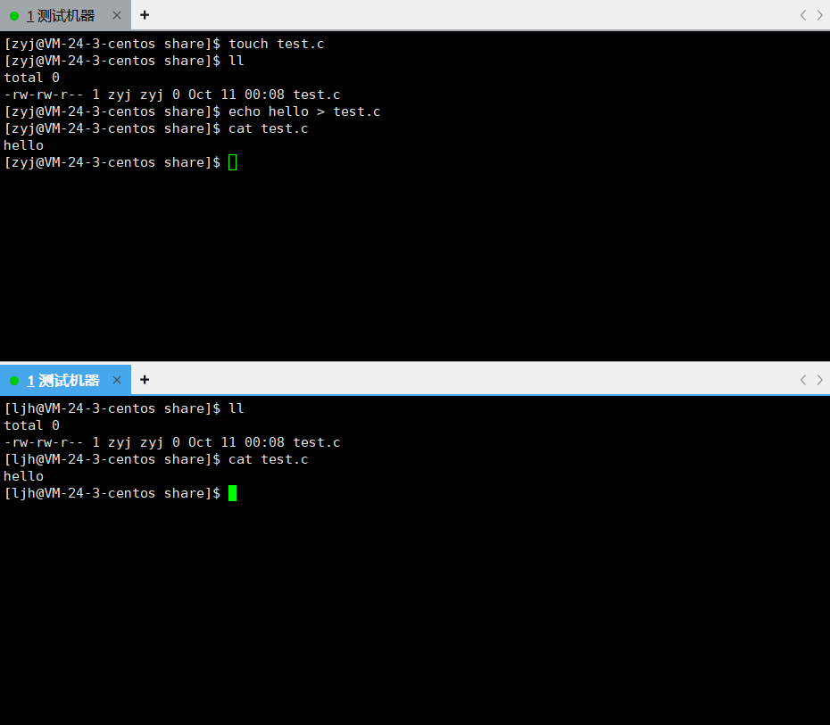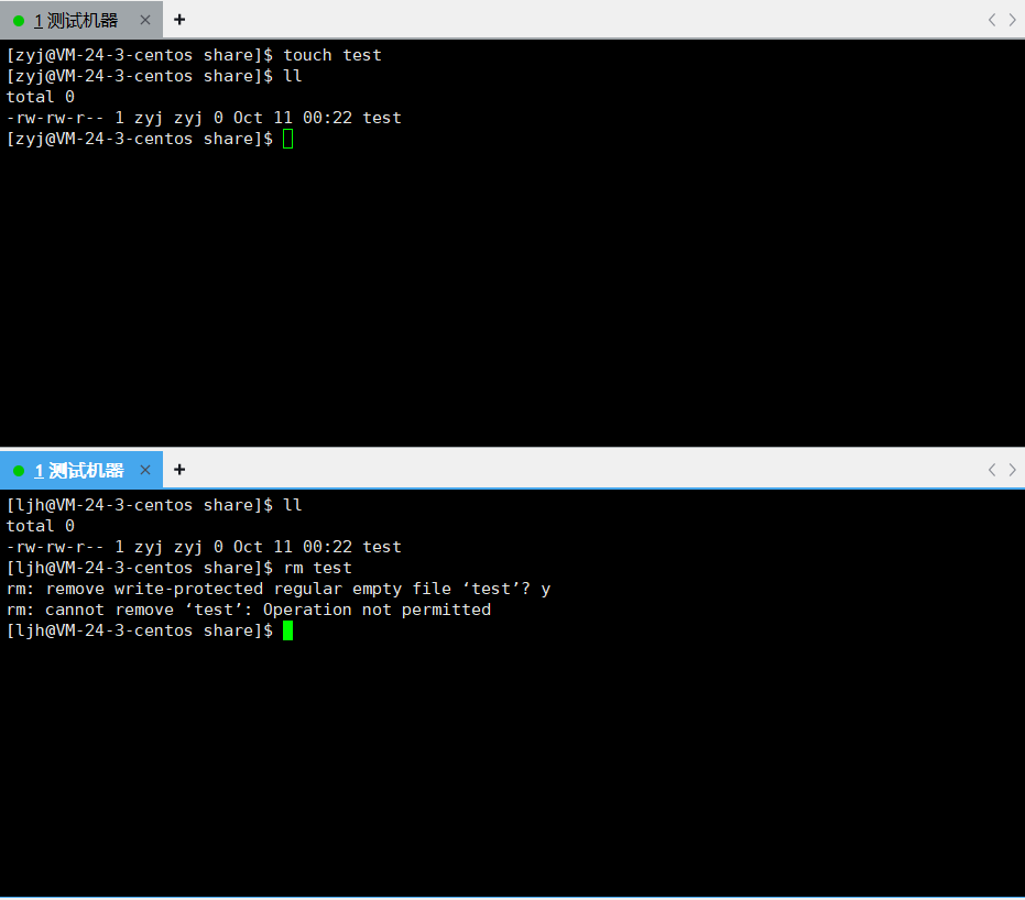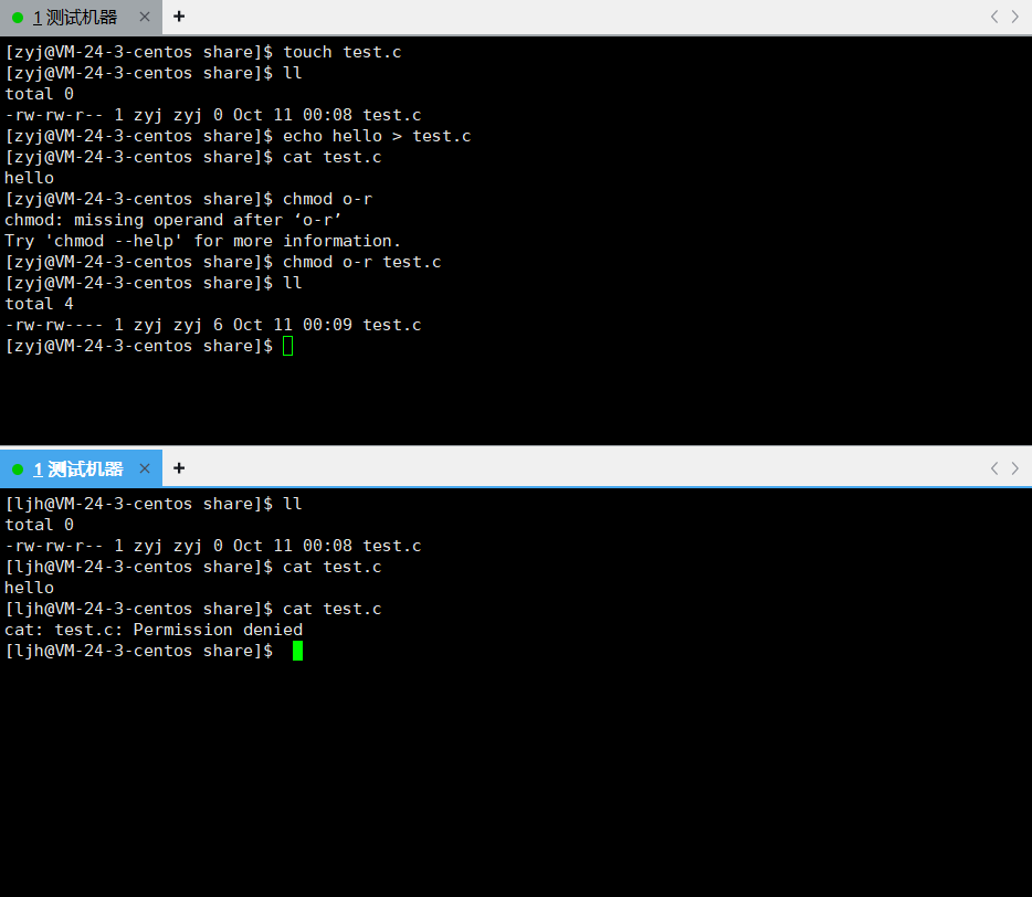 我用zyj用户给文件写了点东西,因为ljh用户有读的权限,所以也能查看文件内容