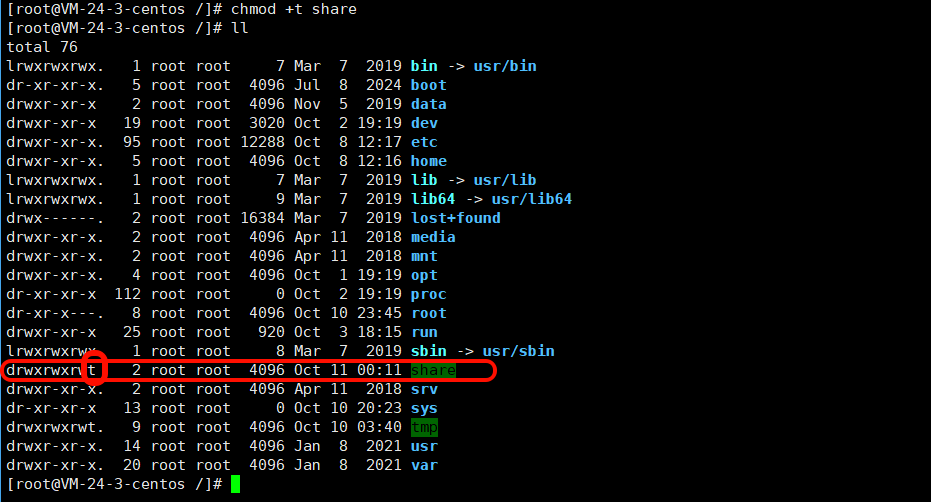 有些人可能想去掉共享文件其他人的w权限,但是这样就不能创建文件了,那么共享文件自然就没有意义了,所以接下来将引入一个新的名词粘滞位