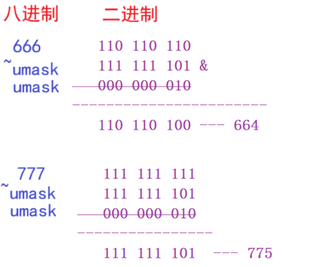 普通用户默认umask是0002(八进制),转换为二进制为000 000 010。对该二进制进行按位取反操作,得到111 111 101。