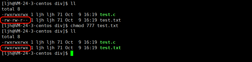 chmod 777 test.txt:把 test.txt 文件的所有者、所属组、其他用户权限都设为可读、可写、可执行。