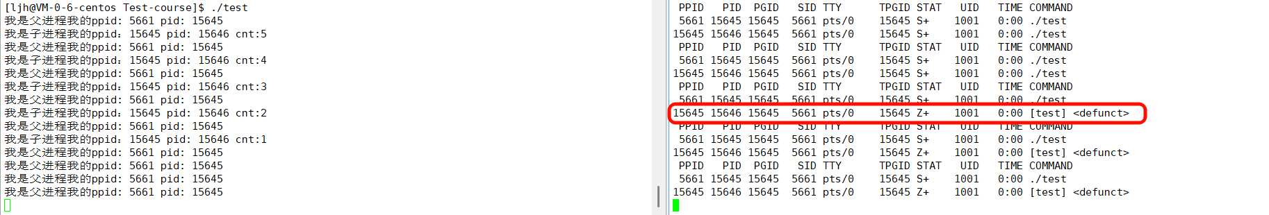 printf后,进程状态始终是R+,这是因为代码里没有了等待 IO 的操作,进程会一直占用 CPU 执行无限循环,所以持续处于运行态(R);同时它是前台进程(+),所以状态显示为R+。