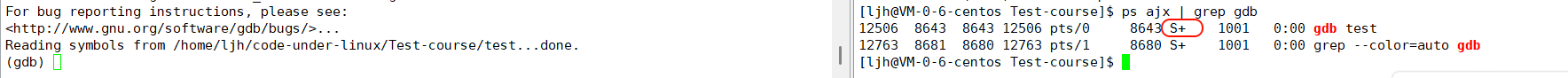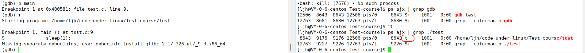 b main打主函数断点、r运行程序后,程序会在断点处暂停 —— 此时被调试的./test 进程进入 t 态(跟踪停止状态),gdb 进程仍保持 S 态(等待后续调试操作)。 这里的t态是停止状态的细分场景,它专门对应 “进程被调试器(如 gdb)跟踪暂停” 的情况,和普通的 T 态(比如用 Ctrl+Z 挂起的停止状态)在触发场景上有所区别。