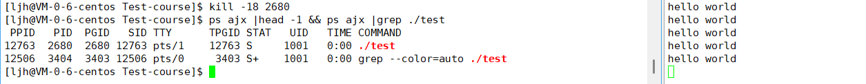 kill -18(对应SIGCONT信号)让进程恢复运行,它回到了之前的S 态(可中断睡眠),同时不再保持前台运行状态。