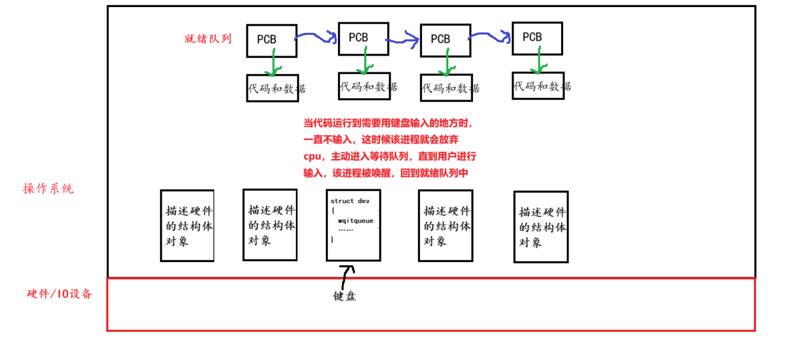 printf函数(向显示器输出内容),进程会进入显示器的等待队列,等待 IO 资源就绪。这个操作会让进程处于 “等待 IO 资源” 的阻塞状态,而 CPU 处理速度极快,进程实际占用 CPU 的时间极短,所以大多数时间都处于阻塞状态,呈现出持续阻塞的状态。