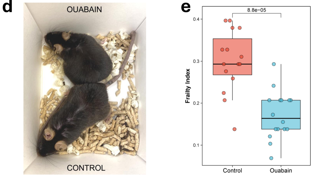 三个月后,当研究人员打开小鼠笼子进行最终评估时,对比显而易见:对照组的老年小鼠毛发杂乱、活动迟缓,面对威胁刺激反应迟钝;而接受间歇性哇巴因治疗的同龄小鼠,毛发整洁、姿态警觉,衰弱指数几乎没有恶化。
