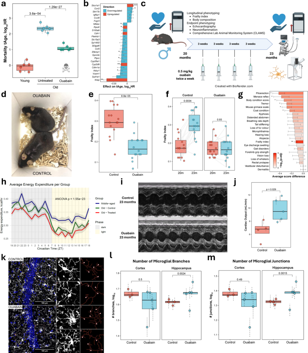 图 5 | 哇巴因的系统性抗衰老效应验证。a) 转录组年龄显著降低;b) 关键贡献基因(Nrep上调);c) 实验时间线;d-g) 衰弱指数完全阻止进展;h) 能量代谢的适度调整;i-j) 心输出量显著提高;k-m) 神经炎症降低(小胶质细胞分支和连接点增加)。