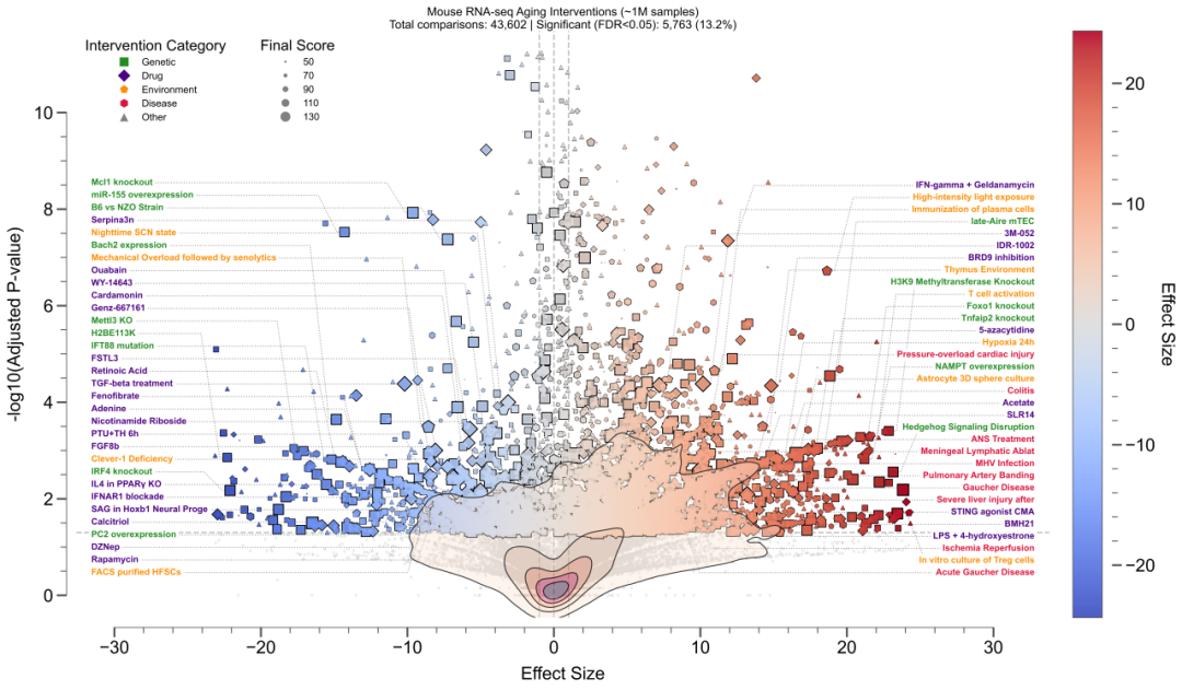 系统重新分析了上万个小鼠RNA-seq研究,涵盖数万个干预-对照比较。分析范围包括基因扰动、药物治疗、环境暴露和疾病模型。统计分析显示,约13%的干预措施显著影响生物学年龄,其中数百个干预获得了很高的综合评分。