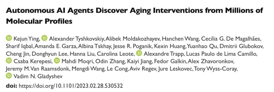Autonomous AI Agents Discover Aging Interventions from Millions of Molecular Profiles. Kejun Ying, Alexander Tyshkovskiy, Alibek Moldakozhayev, Hanchen Wang, Cecília G. De Magalhães, Sharif Iqbal, Amanda E. Garza, Albina Tskhay, Jesse R. Poganik, Kexin Huang, Yuanhao Qu, Dmitrii Glubokov, Cheng Jin, Donghyun Lee, Hanna Liu, Carolina Leote, Alexandre Trapp, Lucas Paulo de Lima Camillo, Csaba Kerepesi, Mahdi Moqri, Odin Zhang, Kaiyi Jiang, Fedor Galkin, Alex Zhavoronkov, Jeremy M. Van Raamsdonk, Mengdi Wang, Le Cong, Aviv Regev, Jure Leskovec, Tony Wyss-Coray, Vadim N. Gladyshev; bioRxiv 2023.02.28.530532