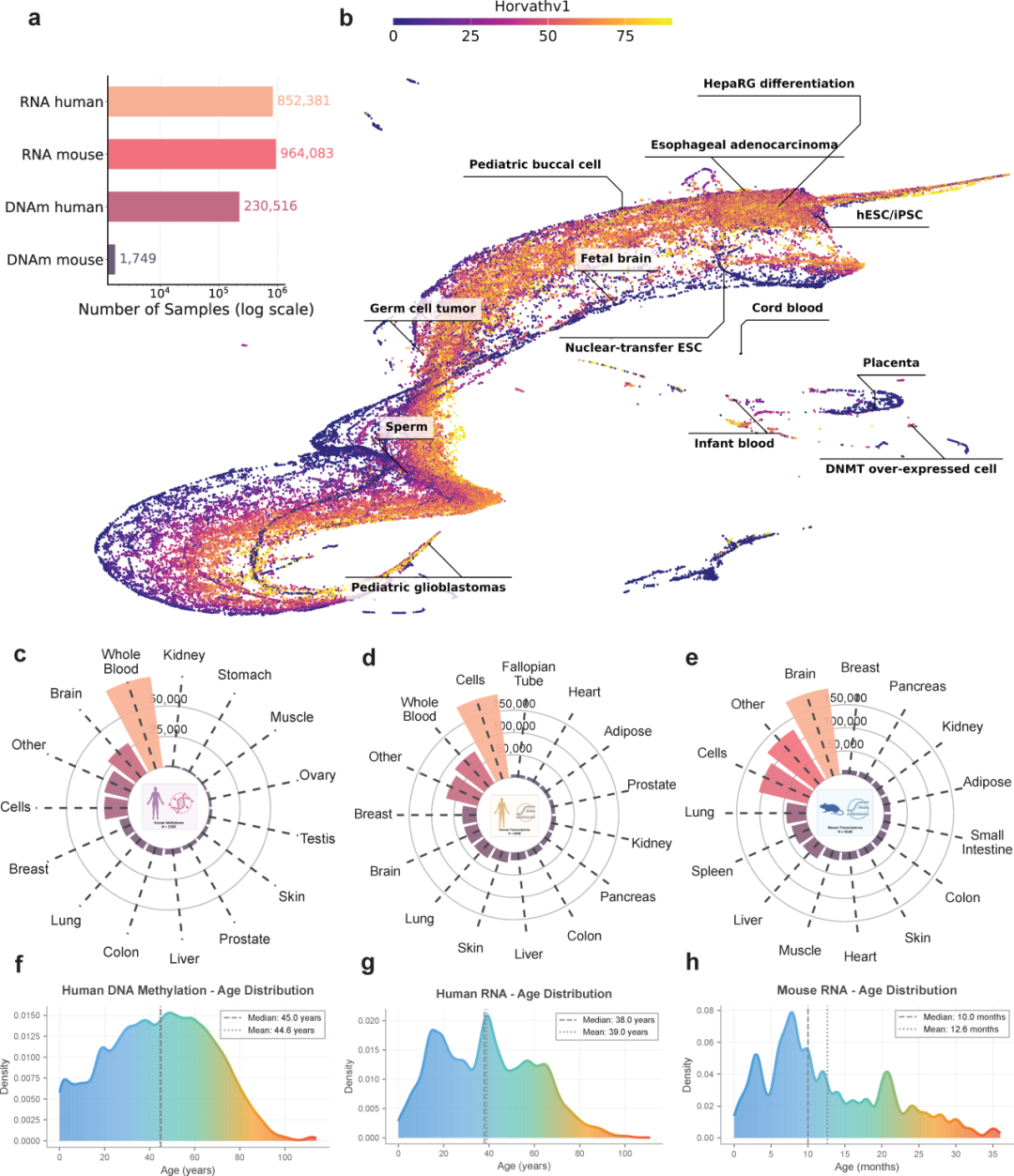 图 3 | 200万样本的综合生物学年龄图谱。a) 四类数据的样本分布;b) 人类DNA甲基化样本的UMAP可视化,颜色代表Horvath时钟预测的生物学年龄;c-e) 人类DNA甲基化、人类RNA和小鼠RNA的组织分布;f-h) 三类数据的年龄分布密度图。