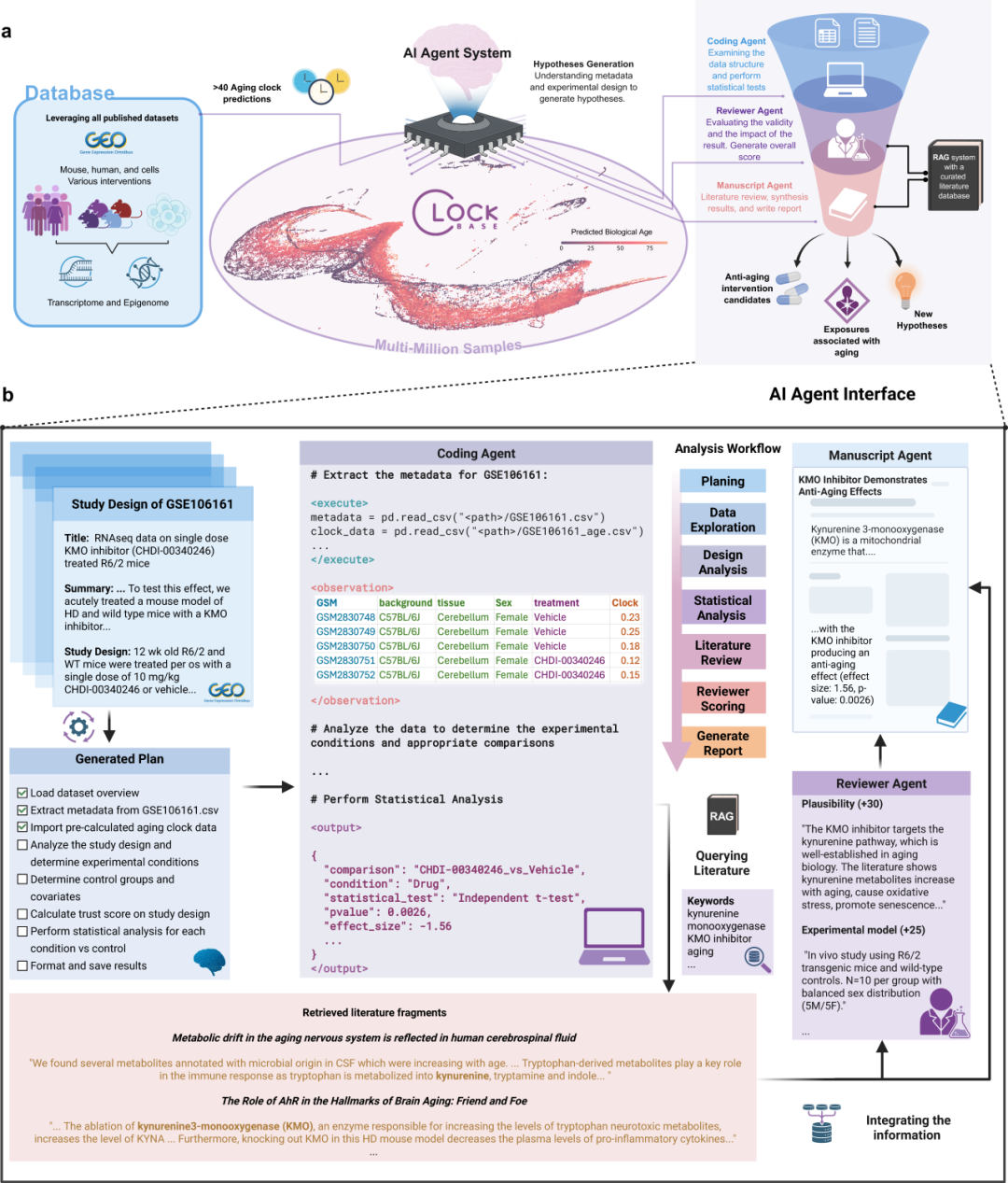 图 2 | ClockBase Agent平台架构与工作流程。a) 系统整合200万份样本、40+衰老时钟和AI智能体框架;b) 以GSE106161为例展示AI智能体的完整分析流程,包括假设生成、统计分析、文献综述和报告撰写。