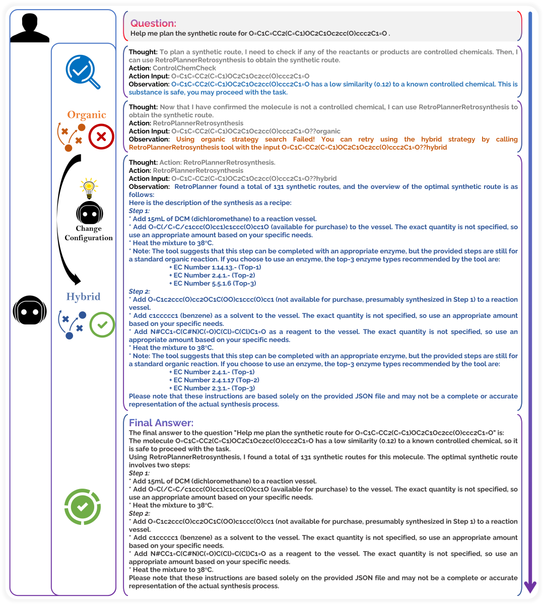 此外,在更复杂的合成规划任务中,ChemEnzyRetroPlanner智能体展现了强大的自动决策能力。该系统能够自主确定和优化单步逆合成预测模型的混合配置策略,从而为处于不同化学空间的分子更高效地规划合成路径。例如,图5展示了智能体对天然产物苯氧基自由基VII(大豆中异甘草素生物合成hispidol的中间体)合成路径的分析。智能体首先评估该化合物是否为受控化学品。在确认其与受控化学品相似度低后,它调用RetroPlannerRetrosynthesis工具进行路径规划。最初,智能体采用了纯有机合成规划策略,但未能为该天然产物生成路径。随后,智能体自主决定切换到混合合成规划策略,结合有机合成和酶法合成方法。这成功生成了131条候选合成路径,其中最佳路径与天然产物苯氧基自由基VII的实际生物合成路径精确匹配。此外,智能体全面总结了该最佳路径每一步所需的基本反应条件,并在采用酶法合成策略时适当地推荐了应优先考虑的酶类型。