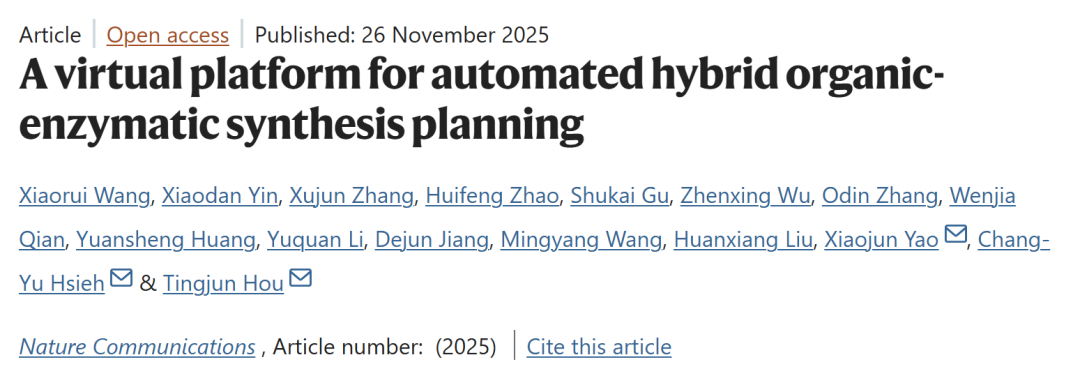 Wang, X.#, Yin, X.#, Zhang, X., Zhao, H., Gu, S., Wu, Z., Zhang, O., Qian, W., Huang, Y., Li, Y., Jiang, D., Wang, M., Liu, H., Yao, X.*, Hsieh, C.-Y.*, & Hou, T.* (2025). A Virtual Platform for Automated Hybrid Organic–Enzymatic Synthesis Planning. Nature Communications.