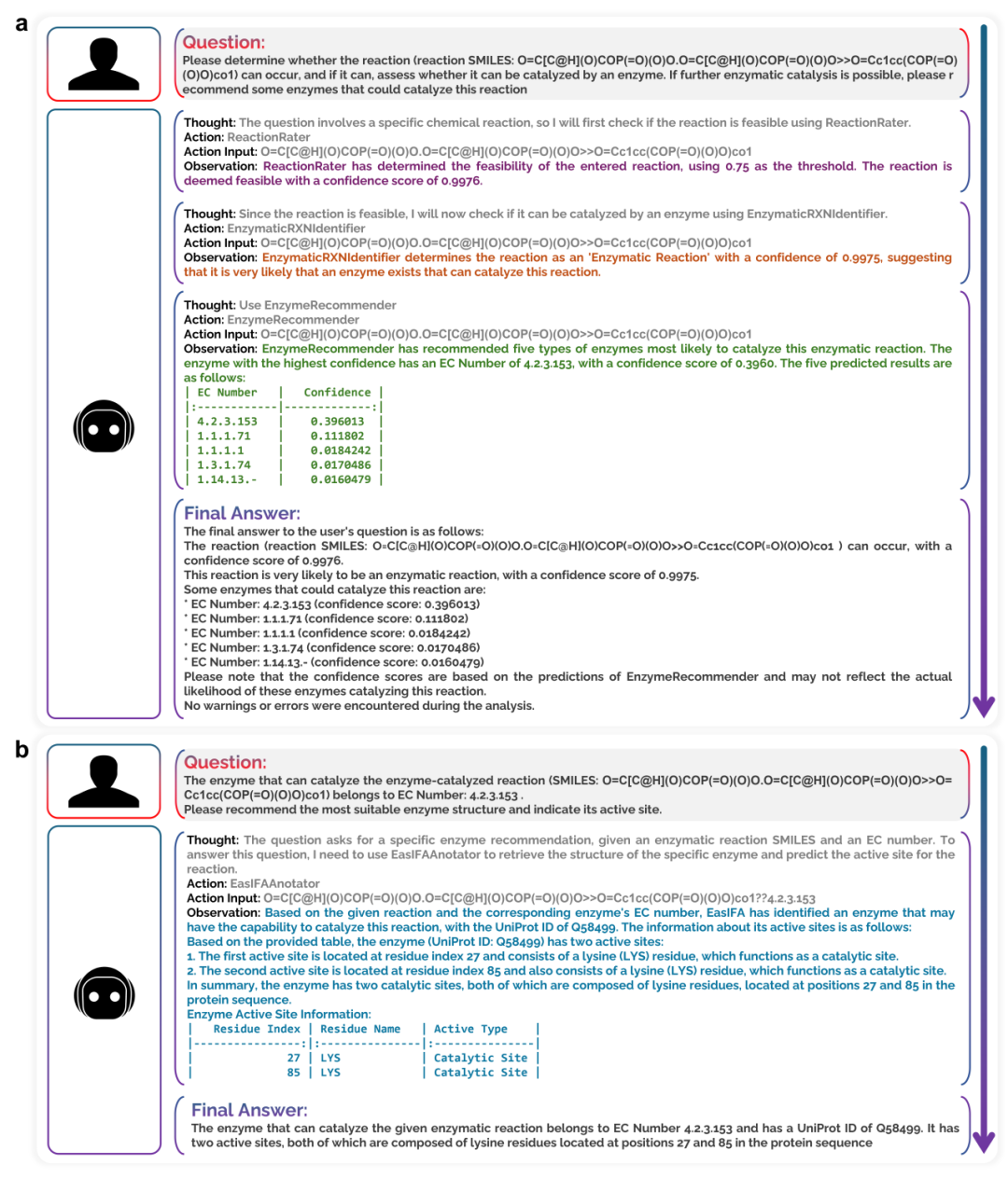 ChemEnzyRetroPlanner包含一个基于编程API的智能体APP,除了执行ChemCrow支持的全离线部署的合成规划任务外,还可以处理反应步骤内的酶促步骤规划和验证任务。图4a展示了工作流程,其中智能体自主评估单步反应的可行性,确定其是否为酶促反应,并推荐酶。智能体首先使用ReactionRater工具评估4-(hydroxymethyl)-2-furancarboxaldehyde phosphate (4-HFC-P)的合成反应是否可行。一旦确认反应可行,即使用EnzymaticRXNIdentifier来确定该反应步骤是否可以由酶催化(即是否为酶促反应)。该工具以0.9975的置信度识别出该单步反应为酶促反应。智能体随后调用EnzymeRecommender,推荐最有可能催化该反应的五种酶类别,其中最可能的酶具有EC编号4.2.3.153。所有推理结果均准确无误。图4b进一步展示了EasIFA模块在推荐最可能的酶实体以及使用活性位点预测来检查推荐酶中是否存在针对给定酶促反应的活性位点方面的应用。结果显示,EasIFA模块推荐了UniProt ID为Q58499的酶,即(5-formylfuran-3-yl)methyl phosphate synthase,其含有两个活性位点LYS27和LYS85,与UniProt中记录的反应位点信息相对应。