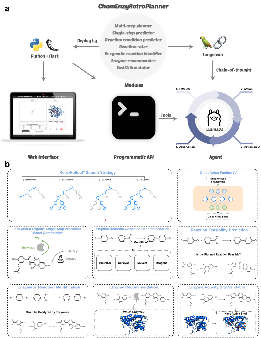 图1:ChemEnzyRetroPlanner 混合合成规划平台概览。(a)平台的技术框架及其支持的三种交互模式:图形界面、程序化 API 和智能 Agent。(b)平台包含的主要算法模块。