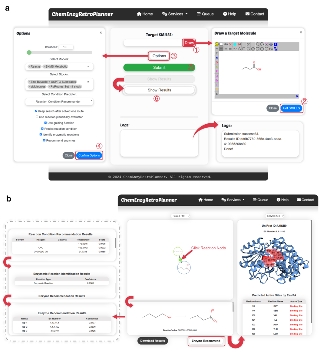 在结果显示方面,用户提供相应的密钥文件后,界面将跳转至结果页面,如图3b上半部分所示。结果页面包含三个主要部分:用于在多条合成路线之间切换的下拉菜单、交互式合成路线展示图和单步反应显示框。对于每条显示的合成路线,用户可以点击反应节点(酶促反应显示为绿色,常规有机反应显示为黄色)以查看该步骤的详细信息。此信息显示在单步反应显示框中,依次显示单步反应方程式、平台推荐的反应条件、酶促反应的识别结果和酶推荐结果。一旦单步反应被识别为酶促反应,“Enzyme Recommend”按钮即变为激活状态。点击此按钮,平台将调用UniProt数据库API以查找推荐EC编号下的酶,并使用EasIFA算法预测活性位点。此时,酶结构显示栏将弹出,允许交互式查看酶的结构。详细的活性位点信息也显示在结构下方的表格中。