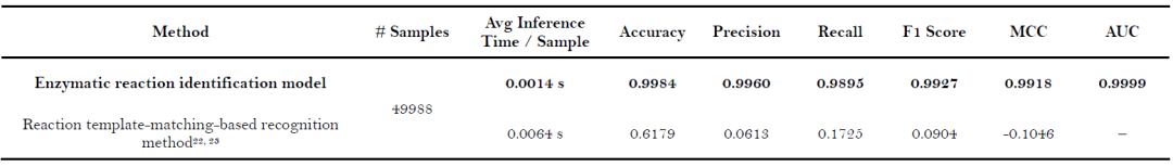 表4: ChemEnzyRetroPlanner 内置酶反应识别模型与基于反应模板匹配的方法对比的基准测试结果。加粗表示最优结果。