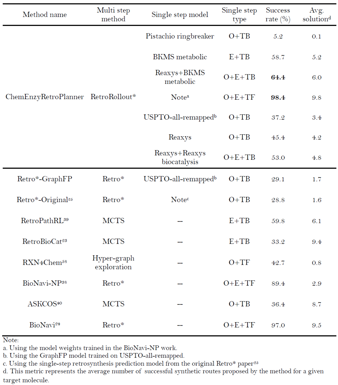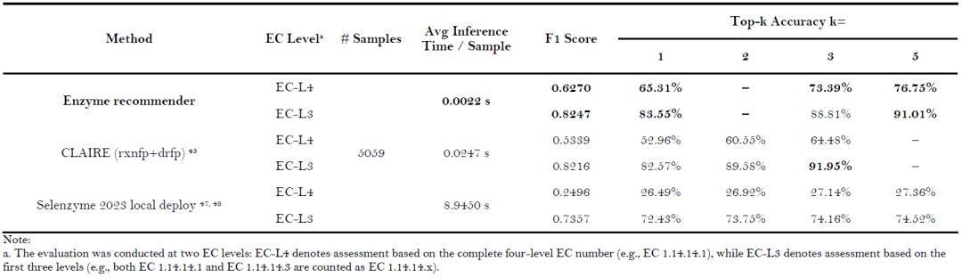 表5: ChemEnzyRetroPlanner 内置酶推荐模型与其他主流酶推荐方法的基准测试结果。加粗表示最优结果。