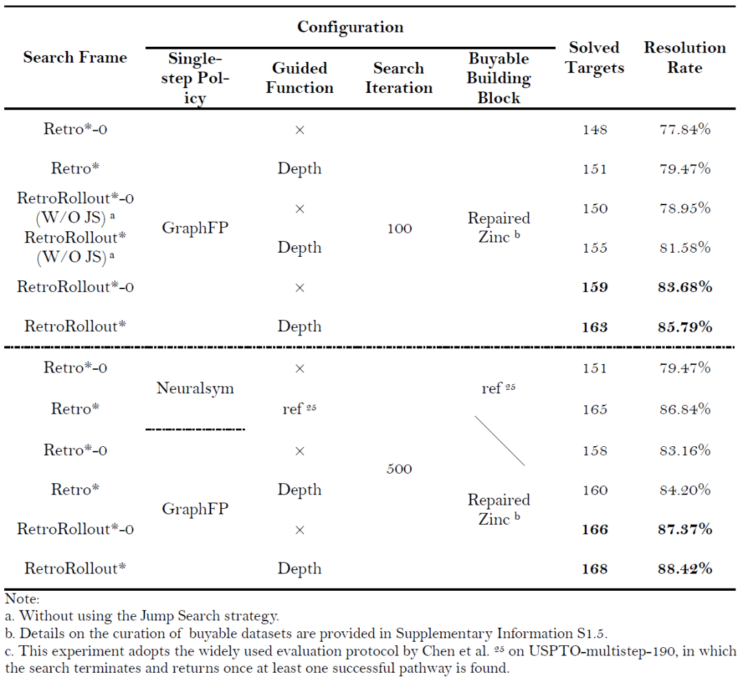 USPTO-multistep-190测试集中的基准测试。 本节比较了搜索框架、跳转搜索策略、引导函数类型、可购买构建块分子数据集的质量以及单步逆合成模型性能对目标分子合成路径搜索表现的影响。所选用的基线算法为原始Retro*,测试分子为Chen等人从USPTO中提取的190个具有代表性的复杂化合物。评估结果如表1所示。