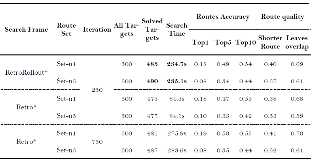 当搜索迭代次数限制为250次时,观察到在Set-n1中,RetroRollout*解决了500个目标分子中的483个,而Retro*仅解决了473个。两个算法框架在Top-1准确率上相当,但RetroRollout*在Top-5和Top-10准确率上更高,其规划的路径平均更短,且与标准路径在叶节点上的重叠率更高。在Set-n5中,RetroRollout*解决了490个分子的路径,而Retro*解决了477个,Retro*在Top-1准确率上略优于RetroRollout*,但RetroRollout*在Top-10准确率上领先。尽管两种算法在Set-n5数据集的Top-k准确率上各有所长,但RetroRollout*规划的路线质量更高,具有更短的路线和更高的标准路线叶节点重叠率。