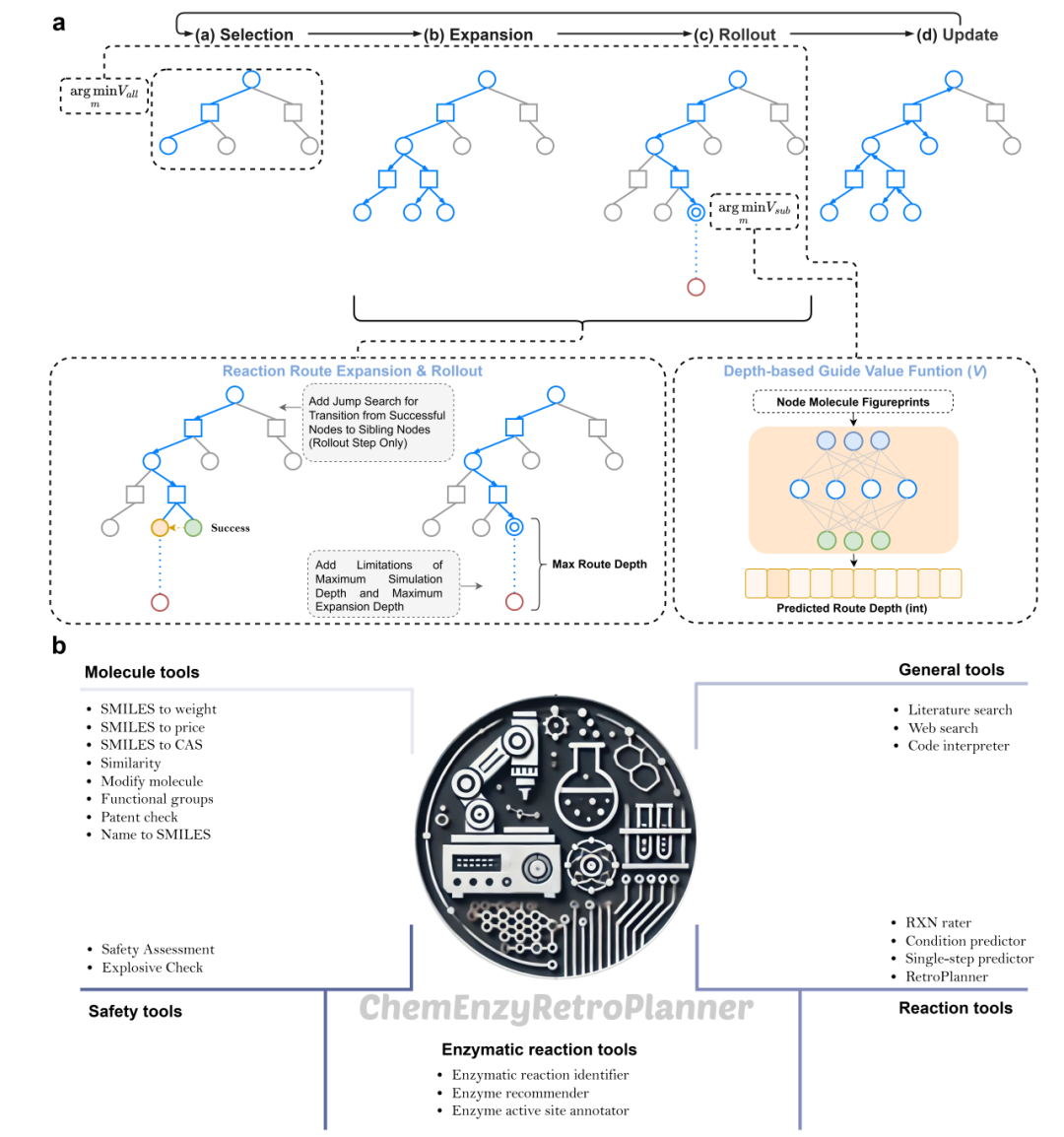 图2:ChemEnzyRetroPlanner 的搜索框架与 Agent 工具集。(a)RetroRollout* 的主要流程示意,包括选择、扩展、Rollout 与更新,并展示 Rollout 阶段的跳跃搜索。(b)Agent 工具集,包括分子工具、反应工具、安全评估工具、通用工具和酶反应工具。