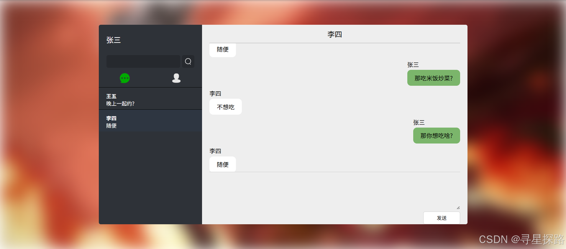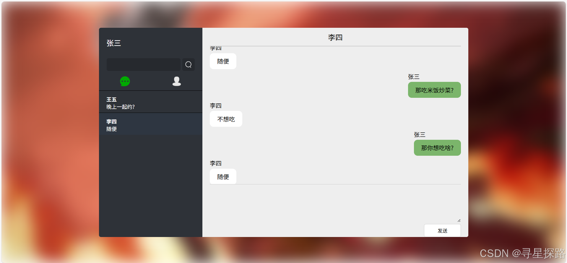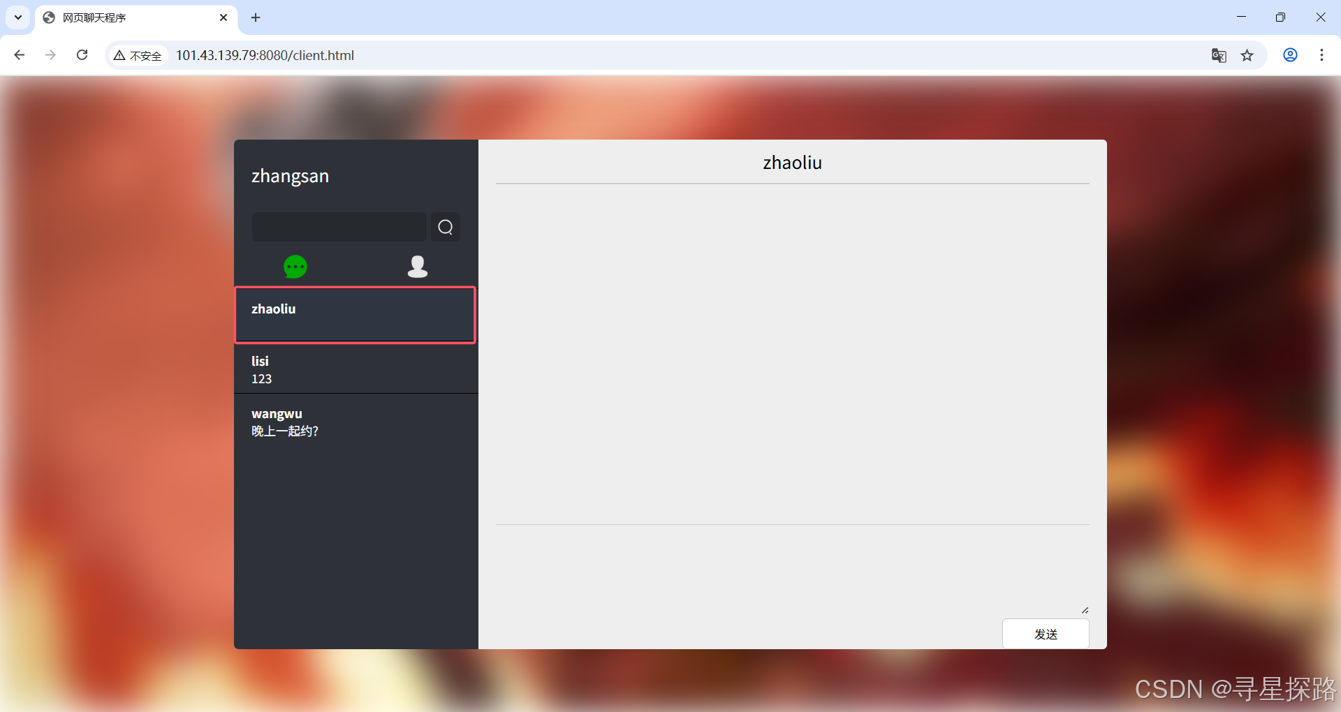 点击一个好友,此时与该好友创建了一个消息会话,可以进行消息的发送。
