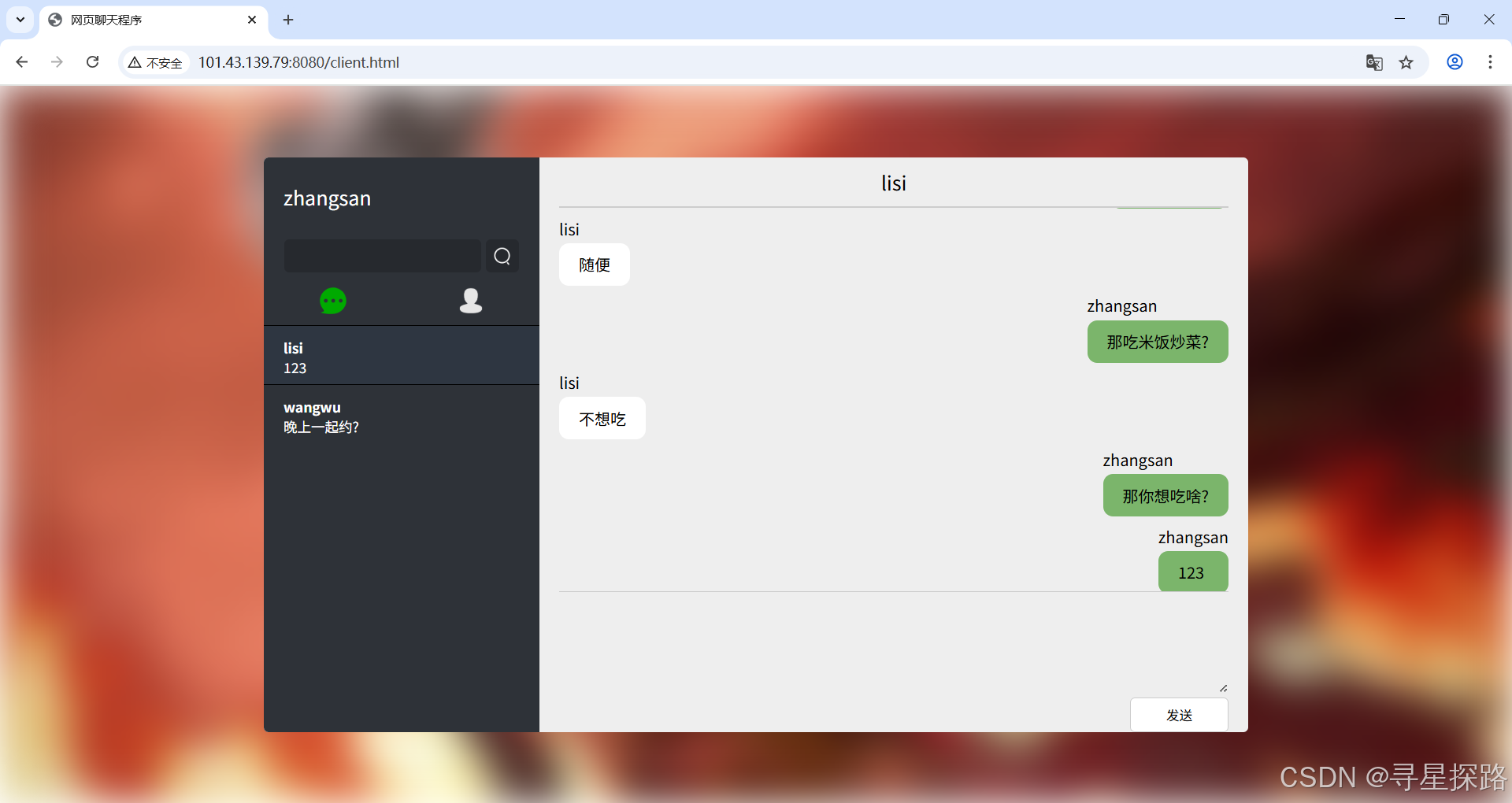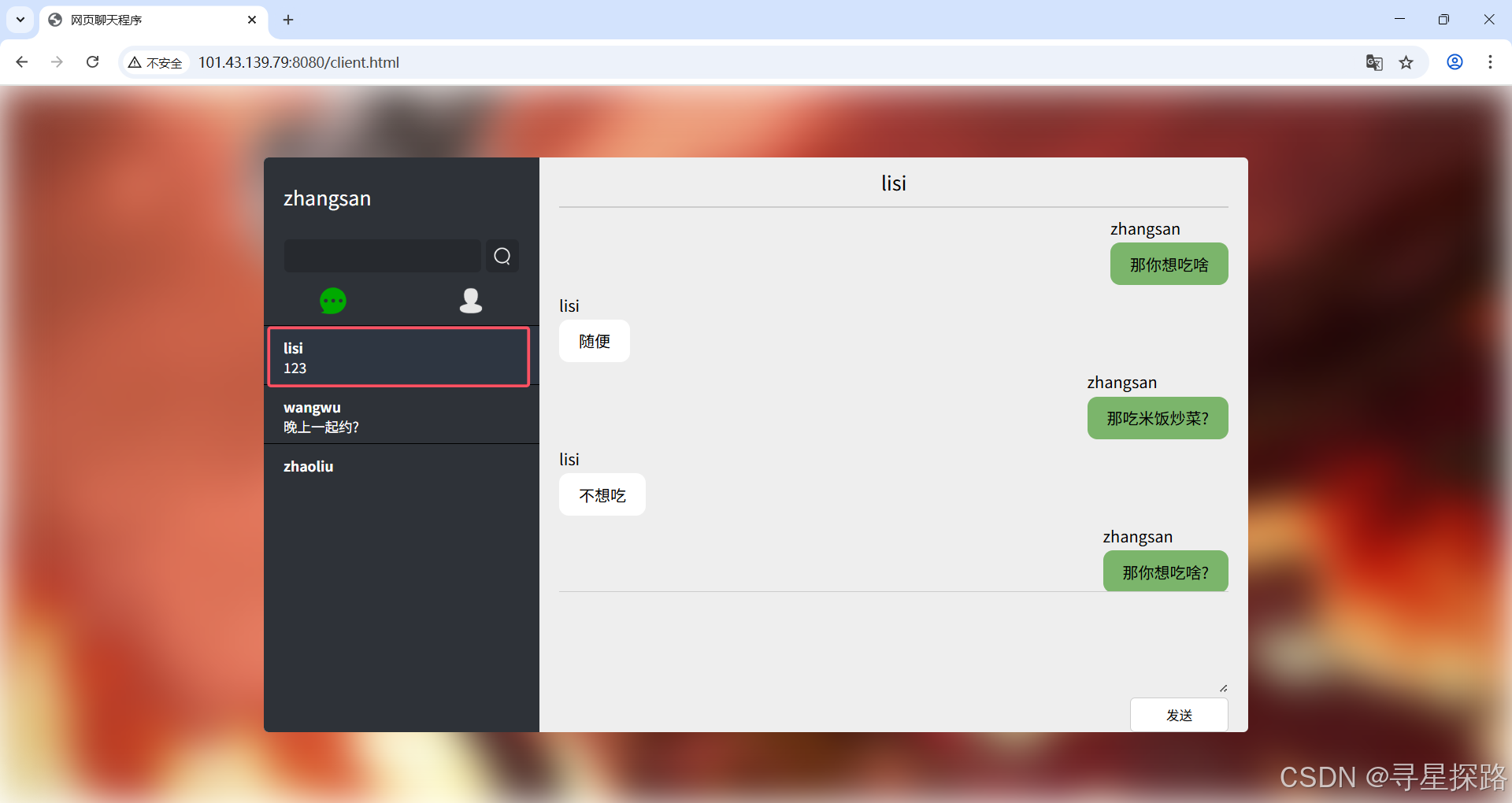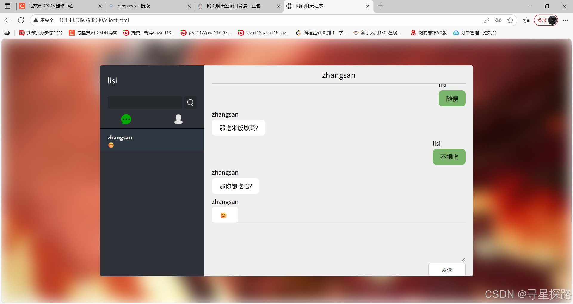 点击一个好友,此时与该好友创建了一个消息会话,可以进行消息的发送。