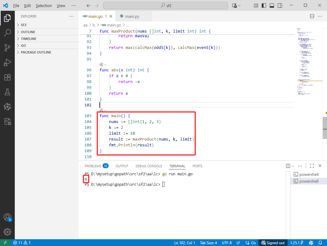 oddS[k] 中的最大乘积值。evenS[k] 中的最大乘积值。n(数组长度)。[-total, total],其中 total <= n * max(nums[i]) = 150 * 12 = 1800,所以范围约 3601 个可能值。limit = 5000,所以每个和的乘积集合最多约 5000 个不同值。O(n * (total * limit)) 太大,但实际剪枝(乘积超过 limit 就丢弃)会大幅减少状态。oddS 和 evenS,键的数量最多约 2 * total + 1,每个键对应的乘积集合大小最多 limit。O(total * limit),即约 1800 * 5000 量级(900 万),但实际不会满,因为乘积不会同时取满所有值。最终答案(题目给的例子):