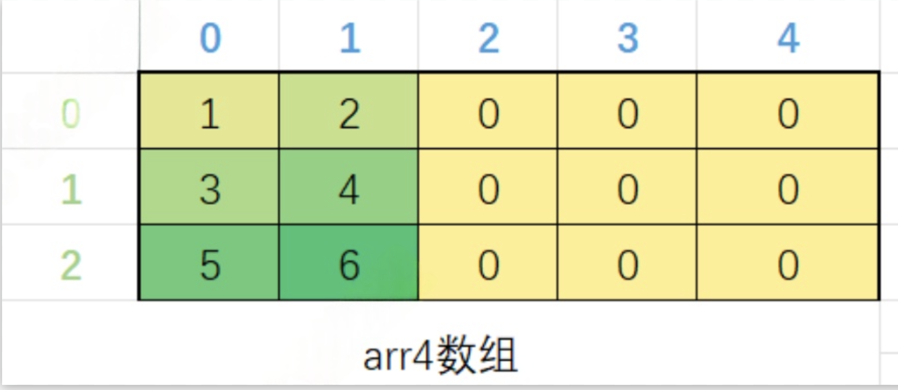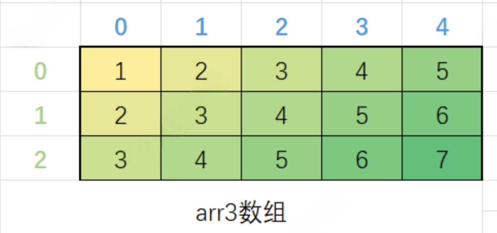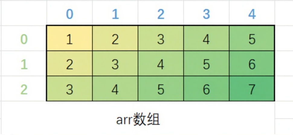 其实我们只要能够按照⼀定的规律产⽣所有的⾏和列的数字就⾏;以上⼀段代码中的arr数组为例,⾏ 的选择范围是0~2,列的取值范围是0~4,所以我们可以借助循环实现⽣成所有的下标。