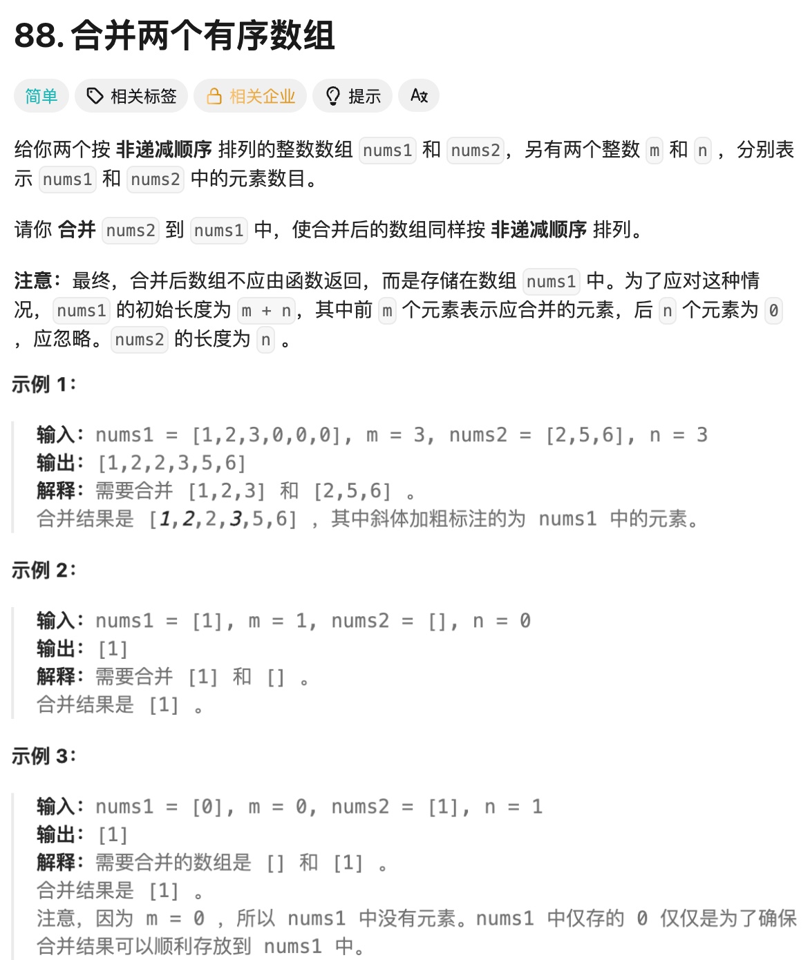 // 1. 合并数组:将nums2的元素放入nums1的尾部