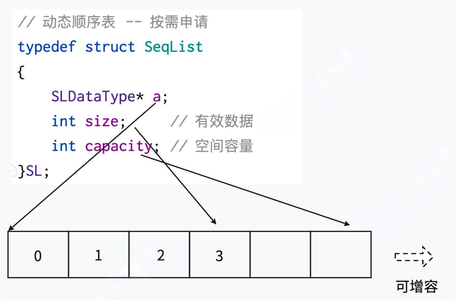 //realloc第二个参数,单位是字节,所以需要newCapacity * sizeof(SLDataType)来计算总字节数。