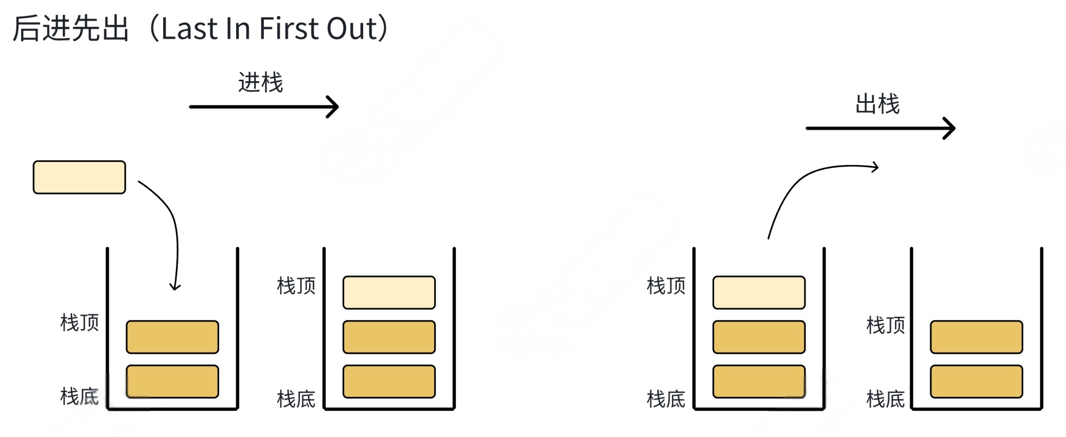 压栈:栈的插⼊操作叫做进栈/压栈/⼊栈,⼊数据在栈顶. 出栈:栈的删除操作叫做出栈.出数据也在栈顶.
