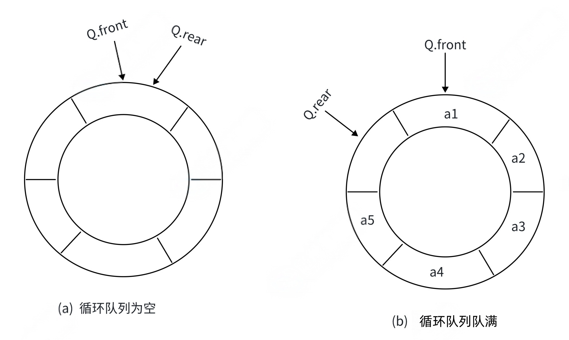 队列为空的判断:front==rear 队列为满的判断:(rear+1)%MAXSIZE=front