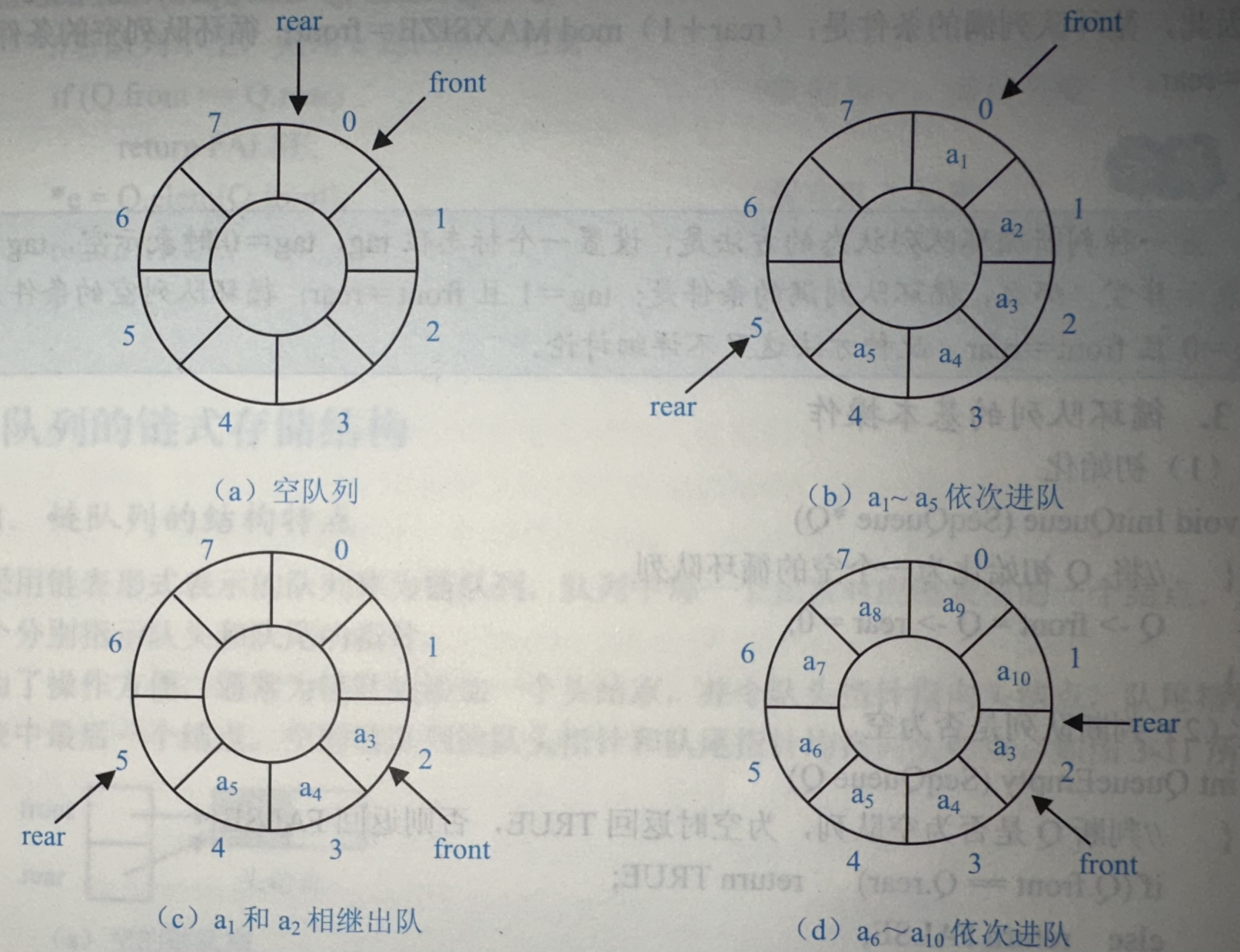 在循环队列中,指针front和rear在到达数组末尾后将自动回到数组开始的位置,即它们是由0~MAXSIZE之间循环变化的.