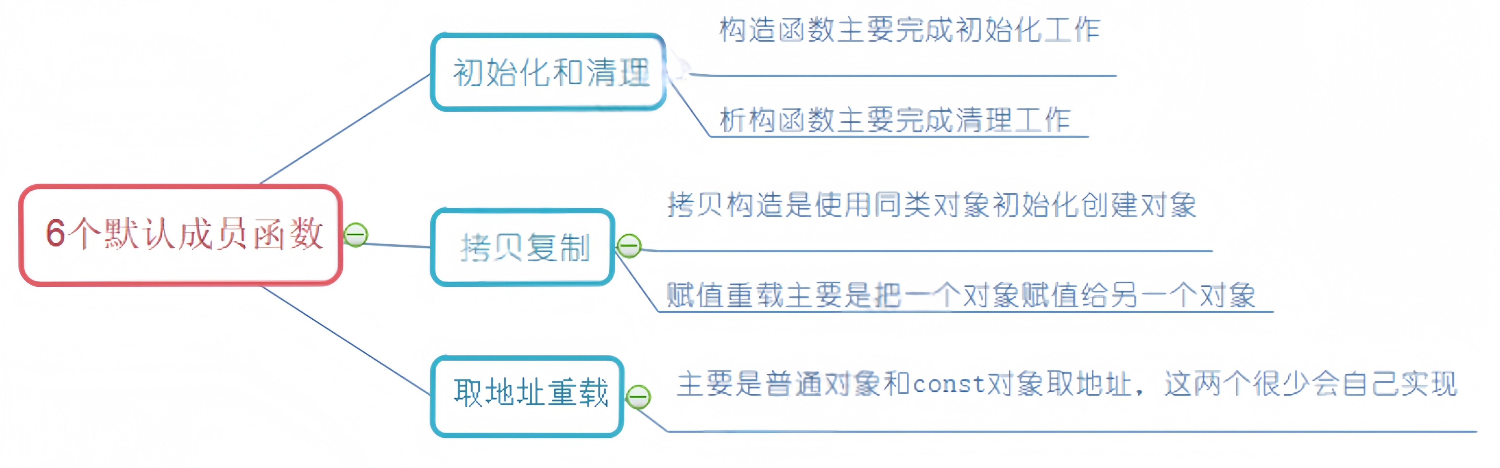 析构函数 | 类中无显式析构函数 | 函数体为空:✅ 自定义类型成员:调用其析构;❌ 内置类型成员:无操作(如不释放动态内存) | 析构顺序与构造相反;动态资源(new/malloc)需显式定义析构释放 |