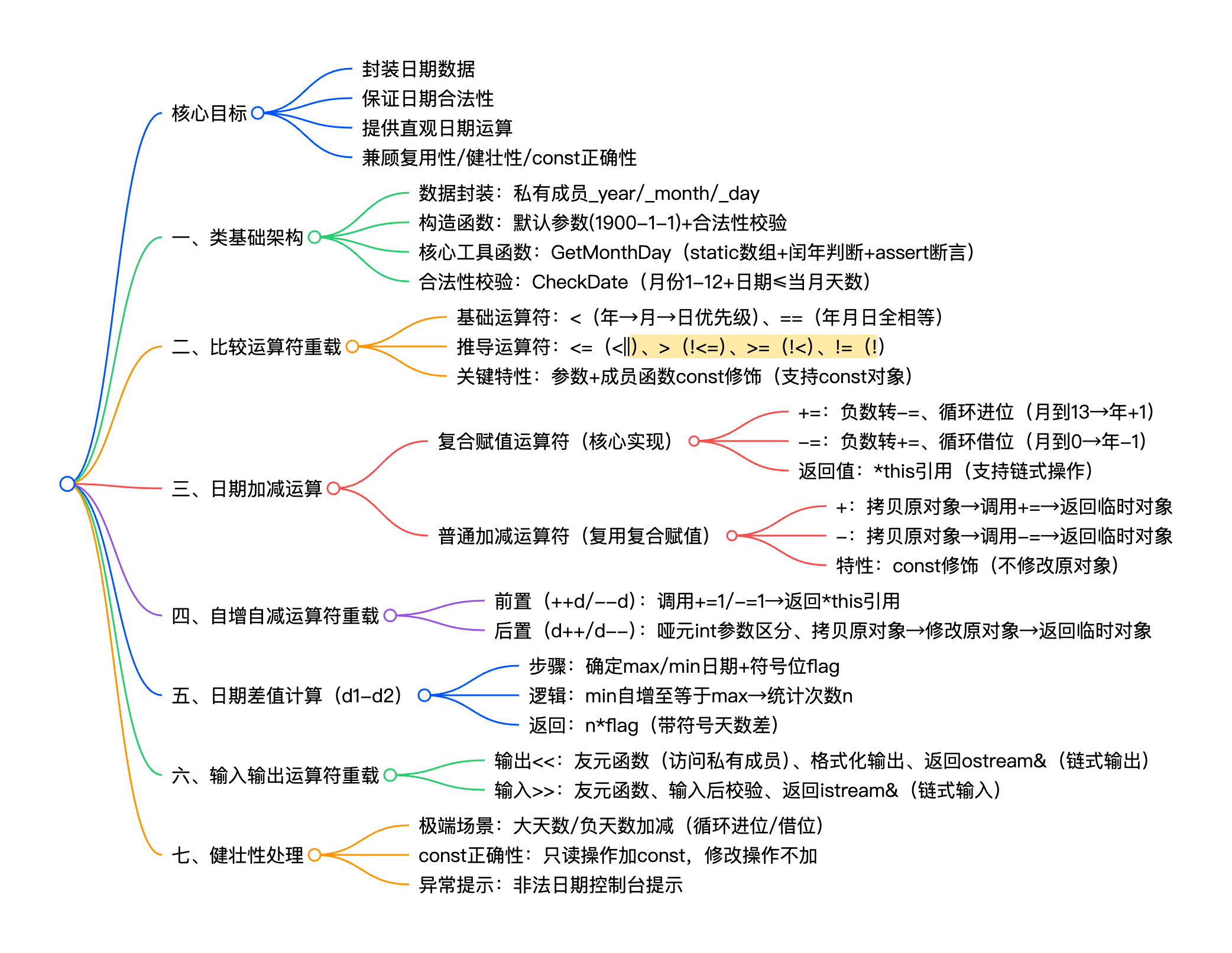 封装日期数据、保证日期合法性、提供符合直觉的日期运算能力,同时兼顾代码复用性、健壮性和const正确性。整体设计遵循“核心功能先实现,复用逻辑后推导”的原则,拆解为以下核心模块: 一、类的基础架构设计 1️⃣数据封装与访问控制