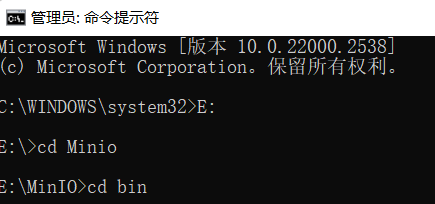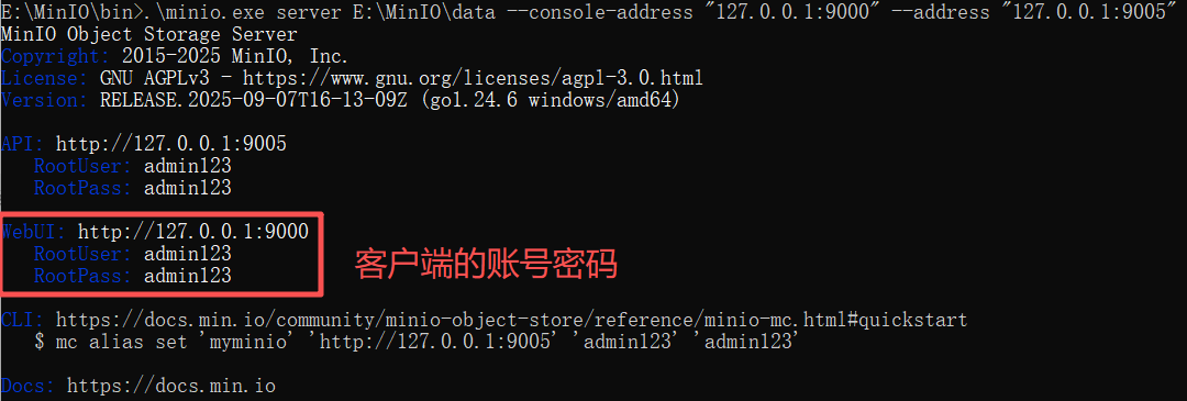 .\minio.exe server E:\MinIO\data --console-address "127.0.0.1:9000" --address "127.0.0.1:9005"
