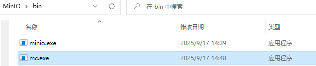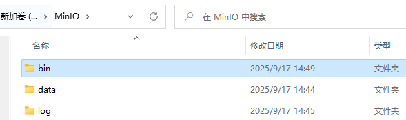 1、创建一个minio的文件夹,存放minio相关文件 2、在minio文件夹中创建minio的应用目录bin,存放mc.exe 以及minio.exe 文件 。 3、在minio文件夹中创建minio的数据目录data,存放相关数据文件 4、在minio文件夹中创建minio的数据目录log,存储相关日志