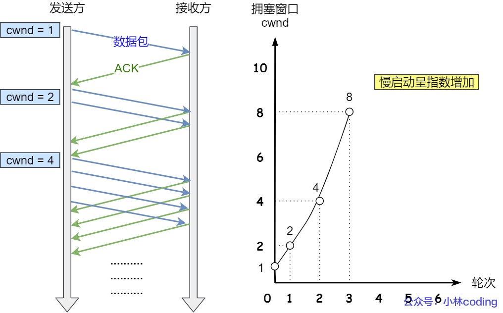 慢启动的算法记住一个规则就行:当发送方每收到一个 ACK,拥塞窗口 cwnd 的大小就会加 1。