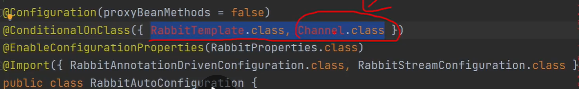 类加载器会加载ConditionalOnclass注解里的这两个类,如果都加载到了,那就表示我需要用到RabbitMQ。如果有一个没加载到,那就表示不需要用到RabbitMQ,我就不需要把配置类的bean加载到bean容器中