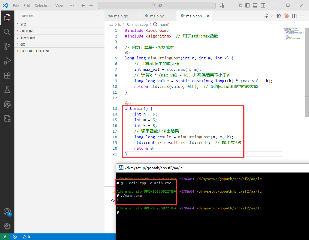 k。k,可以直接装载(无需切割);否则需要切割。每次切割将一段长度为 x 的木料分为 len1 和 len2(len1 + len2 = x),代价为 len1 * len2。k,不需要切割(总段数为二),成本为0。k,另一根小于等于 k,则只需切割长木料一次(总段数变为三),成本为切割长木料的代价。k,则至少需要切割两次(总段数至少为四),但车辆不足,无法运输。不过题目保证输入数据总是有解,因此这种情况不会出现(输入约束 n, m ≤ 2*k 且至少一根木料长度 ≤ k)。maxLen = max(n, m)。maxLen ≤ k,说明两根木料均无需切割,直接返回成本 0。maxLen > k,则必须切割长木料。最小切割代价发生在将长木料一端切下尽可能小的一段(以满足每段 ≤ k):k,另一段长度为 maxLen - k,代价为 k * (maxLen - k)。n = 6, m = 5, k = 5 时,切割长木料(长度6)为 1 和 5,代价 1 * 5 = 5。k * (max(n, m) - k) 计算该代价,并与 0 取最大值(避免负值)。max(n, m) > k 时,题目保证另一根木料长度 min(n, m) ≤ k(否则无解)。因此短木料无需切割,直接装载即可。n, m, k 的临时值),不随输入规模变化。.