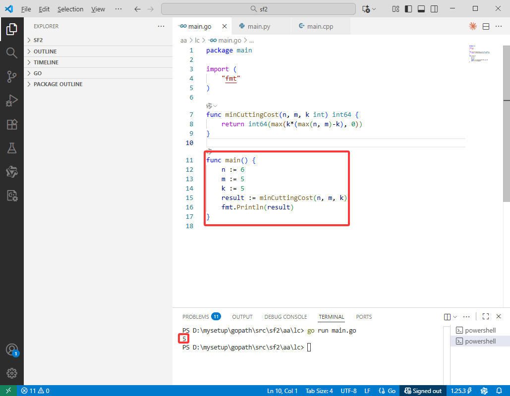 2025-11-11:木材运输的最小成本。用go语言,给定两根木料,长度分别为 n 和 m。要用三辆卡车运走它们,每辆车只能装一段木头,且所装木段的长度不能超过 k。你可以把一根木头切成若干更短的段;每次把长度为 x 的段分成 len1 和 len2 时需付出代价 len1 * len2(且 len1 + len2 = x),可以进行多次切割以得到更多段。求在满足每辆车最多装一段且每段长度 ≤ k 的前提下,使两根木料都能被装运的最低总切割费用;若不需要切割则费用为 0。