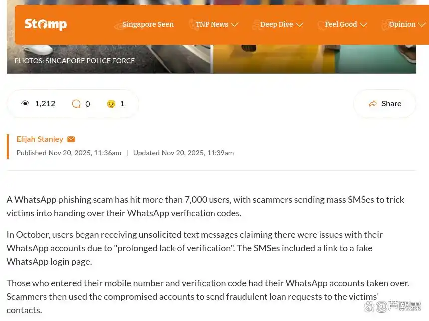 随着端到端加密通信的普及,WhatsApp 已成为全球超20亿用户日常交流的核心工具,亦因其高活跃度与强信任关系,成为网络犯罪分子的重点目标。2025年第四季度,新加坡警方披露的一起跨境钓鱼案件揭示了新型社交平台攻击范式:攻击者不再依赖恶意软件或漏洞利用,而是通过精准社会工程与实时代理技术,直接窃取用户身份凭证中的动态验证码,实现账户完全接管。